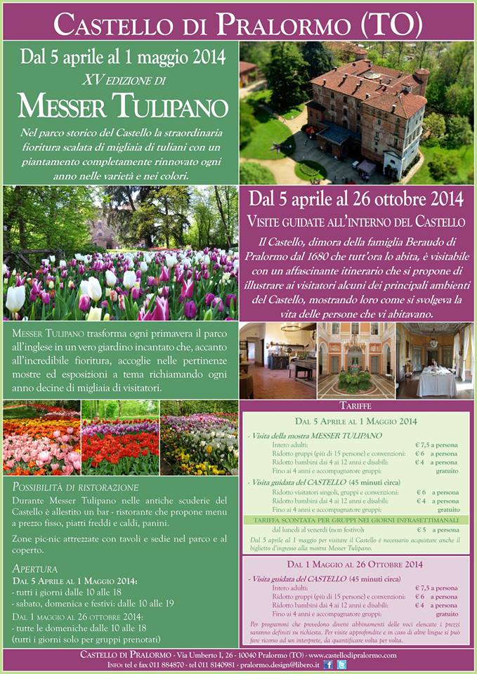 Dal 5 Aprile al 1 Maggio 2014 ci trasferiamo nell'incantevole Castello di Pralormo (Torino) in occasione dell'evento "Messer Tulipano 2014". Si tratta di una kermesse spettacolare sul mondo dei fiori, in particolare dedicata ai primaverili tulipani in piena fioritura tra i viali del giardino del Castello. Si potrà apprendere ed approfondire il loro utilizzo decorativo e creativo in un contesto ricchissimo di varietà e colori. Il tema dell'edizione di quest'anno sono i giardini in miniatura e noi daremo il nostro contributo con le nostre creazioni in vetro soffiato, per l'occasione anch'esse molto floreali! Durante il mese di rassegna diverse agenzie di viaggio organizzeranno gite al Castello e noi offriremo dimostrazioni dal vivo di soffiatura del vetro. Aspettiamo tutti i nostri amici per un'esperienza davvero originale e particolare! Se aderite a questo invito, vi terremo informati su tutti i dettagli e sugli eventi collaterali.